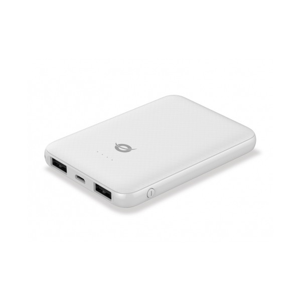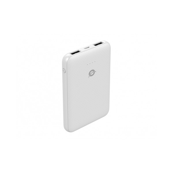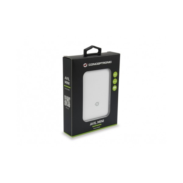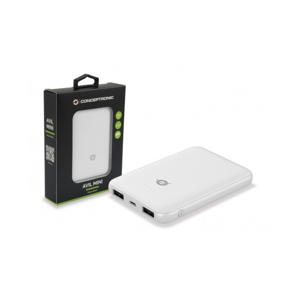 Conceptronic AVIL04W. Capacità della batteria: 5000 mAh, Tecnologia batteria: Polimeri di litio (LiPo), Voltaggio della batteria: 3,7 V. Porte di uscita USB di tipo A: 2. Potenza di uscita totale: 10 W, Corrente d'uscita: 2 A. Colore del prodotto: Bianco