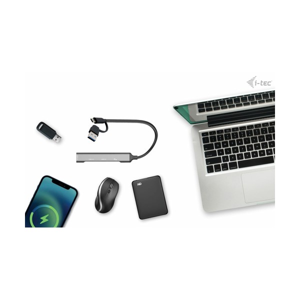 Con questo hub si ottengono 4 porte USB aggiuntive: una porta USB 3.0 standard e tre porte USB 2.0. Collegate una tastiera e un mouse esterni, trasferite dati o filmati da un’unità flash USB a velocità fino a 5 Gbps o ricaricate i vostri dispositivi mobili (velocità USB standard 0,9A).