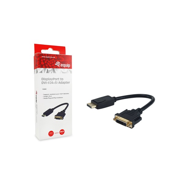 Equip 133443. Lunghezza cavo: 0,25 m, Connettore 1: DVI-I, Connettore 2: HDMI tipo A (Standard). Certificati di sostenibilità: CE, RoHS. Peso: 48 g, Larghezza: 15 mm, Profondità: 35 mm. Larghezza imballo: 70 mm, Profondità imballo: 20 mm, Altezza imballo: 160 mm. Larghezza scatola principale: 280 mm, Lunghezza del cartone principale: 300 mm, Altezza scatola principale: 490 mm