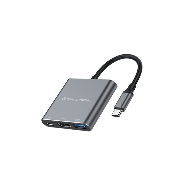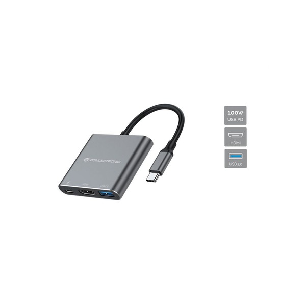 Conceptronic DONN18G. Tecnologia di connessione: Cablato, Interfaccia host: USB 3.2 Gen 1 (3.1 Gen 1) Type-C, Fornitura di alimentazione USB fino a: 100 W. Colore del prodotto: Grigio, Velocità di trasferimento dati: 5 Gbit/s, Tipologia HD: 4K Ultra HD. Tipologia alimentazione: USB, Lunghezza cavo USB: 0,25 m. Altri sistemi operativi supportati: ChromeOS. Larghezza: 58 mm, Profondità: 52 mm, Altezza: 12 mm