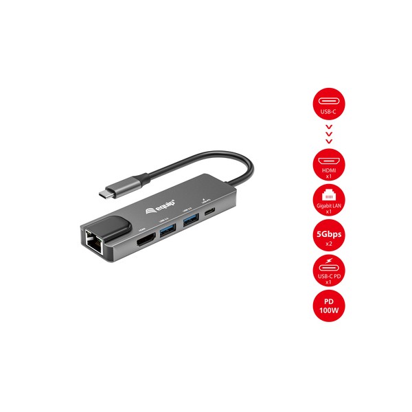 Equip 133489. Tecnologia di connessione: Cablato, Interfaccia host: USB 3.2 Gen 1 (3.1 Gen 1) Type-C, Fornitura di alimentazione USB fino a: 100 W. Velocità trasferimento Ethernet LAN: 10,100,1000 Mbit/s. Colore del prodotto: Grigio, Velocità di trasferimento dati: 5 Gbit/s, Tipologia HD: 4K Ultra HD. Tipologia alimentazione: USB, Lunghezza cavo USB: 0,25 m. Sistema operativo Windows supportato: Windows 10, Windows 10 Education, Windows 10 Education x64, Windows 10 Enterprise, Windows 10..., Compatibilità sistema operativo Mac: Mac OS X 10.10 Yosemite, Mac OS X 10.12 Sierra, Mac OS X 10.13 High Sierra, Mac OS X 10.14 Mojave,..., Sistema operativo mobile supportato: Android 10.0, Android 11.0, Android 12.0, Android 13.0, Android 5.0, Android 5.1, Android 6.0,...