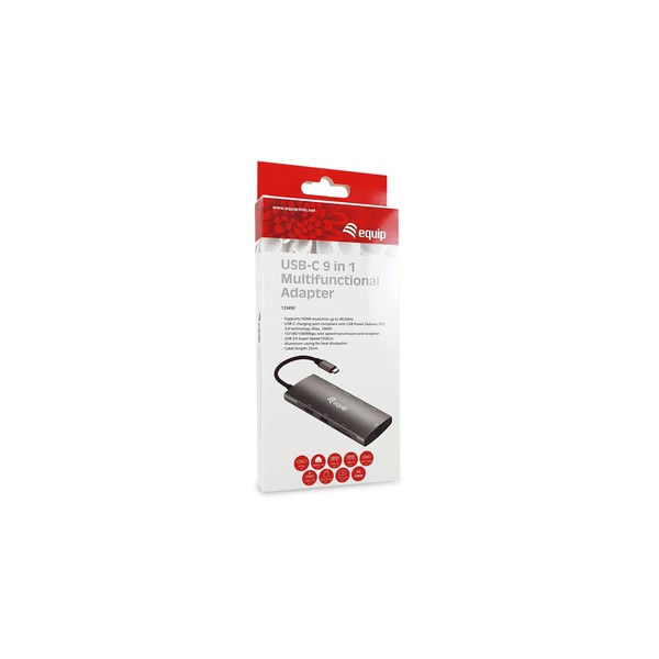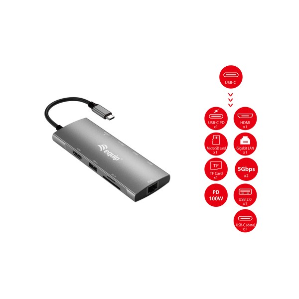 Equip 133490. Tecnologia di connessione: Cablato, Interfaccia host: USB 3.2 Gen 1 (3.1 Gen 1) Type-C, Fornitura di alimentazione USB fino a: 100 W. Velocità trasferimento Ethernet LAN: 10,100,1000 Mbit/s. Colore del prodotto: Grigio, Tipi schede di memoria: MicroSD (TransFlash), SD, SDHC, SDXC, Velocità di trasferimento dati: 5 Gbit/s. Lunghezza cavo USB: 0,25 m. Sistema operativo Windows supportato: Windows 11 Enterprise x64, Windows 7 Professional x64, Windows Vista Enterprise x64, Windows 10,..., Compatibilità sistema operativo Mac: Mac OS X 10.10 Yosemite, Mac OS X 10.11 El Capitan, Mac OS X 10.12 Sierra, Mac OS X 10.13 High..., Sistema operativo mobile supportato: Android 10.0, Android 11.0, Android 12.0, Android 13.0, Android 5.0, Android 5.1, Android 6.0,...