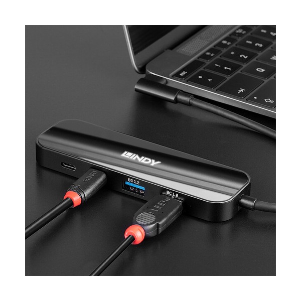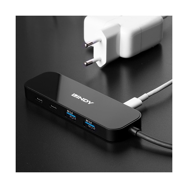 L'hub USB 3.2 Gen 2 tipo C da 4 porte di Lindy offre all'utente la possibilità di collegare 2 periferiche USB di tipo A e 2 di tipo C a un notebook o Macbook dotato di USB tipo C con velocità di trasferimento dati fino a 10Gbps. L'hub dispone anche di una porta USB Tipo C che supporta Power Delivery fino a 100W e trasmette i dati attraverso un singolo cavo. La tecnologia Power Delivery 3.0 supporta una potenza bidirezionale sino a quasi 100 Watt e permette di raggiungere valori di tensione e corrente più elevati da scambiare tra i dispositivi collegati - host o periferiche.