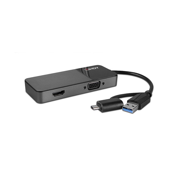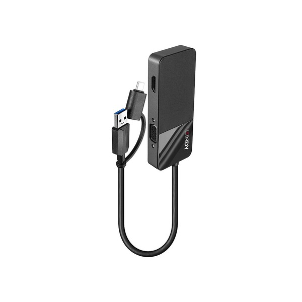Lindy 43354. Interfaccia host: USB 3.2 Gen 1 (3.1 Gen 1) Type-A + Type-C. Colore del prodotto: Nero, Tempo massimo di refresh: 60 Hz, Interfacce hub: HDMI, VGA. Tipo alimentazione: USB. Larghezza: 43 mm, Profondità: 105 mm, Altezza: 14 mm. Quantità per pacco: 1 pz, Larghezza imballo: 194 mm, Profondità imballo: 174 mm