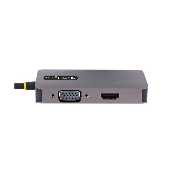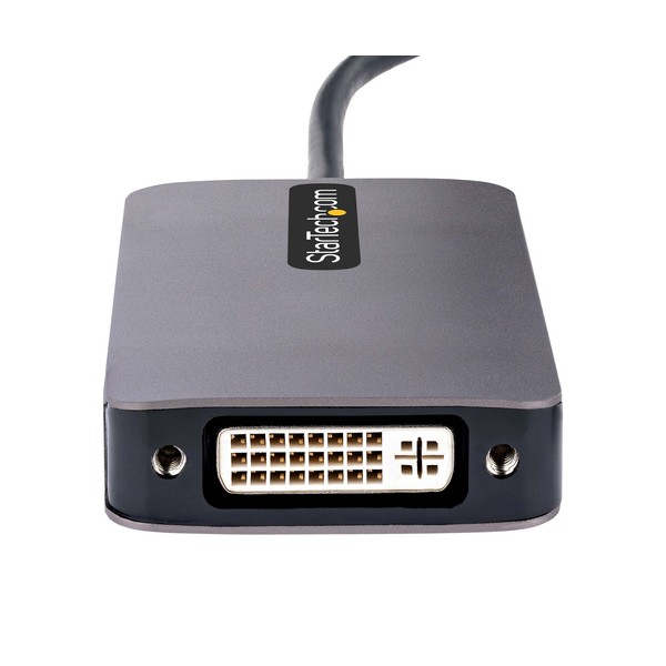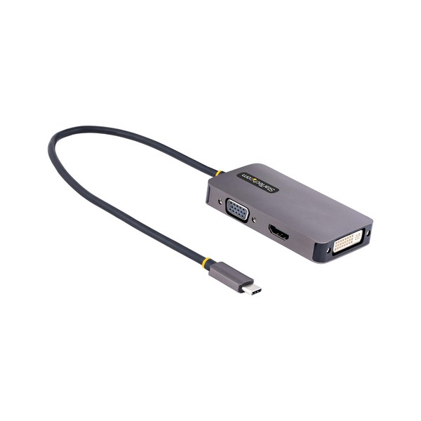 USB Type-C™ a VGA DVI o HDMI® Adattatore da viaggio | 4K 60Hz | AlluminioQuesto adattatore video USB-C™ multiporta offre una soluzione durevole e portatile per collegare un dispositivo USB Type-C a un display HDMI, DVI o VGA.Risoluzione Ultra HD 4K 60HzL'uscita HDMI 2.0b supporta risoluzioni fino a 4K 60 Hz e HDR, mentre l'uscita VGA supporta fino a 1920x1200 a 60 Hz, e l'uscita DVI-I supporta fino a 1080p a 60 Hz. Tutte le uscite assicurano compatibilità con i vecchi display supportando risoluzioni inferiori. L'adattatore supporta il doppio display 1080p in modalità mirroring quando si usano configurazioni monitor VGA e HDMI o VGA e DVI-I.Connettività Video in ViaggioConsente di evitare il fastidio di trasportare diversi adattatori grazie all'adattatore video USB Type-C multiporta. Consente di collegare un dispositivo USB-C DisplayPort Alt-mode praticamente a qualsiasi display. Grazie al resistente box esterno in alluminio, l'adattatore può essere trasportato senza problemi in una borsa da viaggio tra ufficio, casa, spazi condivisi e durante spostamenti di lavoro.Semplicità d'UsoL'adattatore per display USB Type-C è compatibile con USB-C DisplayPort Alt-mode, laptop Thunderbolt 3 e Thunderbolt 4, Ultrabook, Chromebook e MacBook. La funzionalità Plug and Play (PnP) permette di connettersi rapidamente a dispositivi Windows, macOS, iPadOS, chromeOS o Linux. Le uscite VGA e DVI sono compatibili con i cavi muniti di fissaggio a vite che assicurano una connessione sicura con display e proiettori. Il cavo integrato lungo 30 cm garantisce una maggiore flessibilità di configurazione e minore sforzo su porte e connettori.Il modello 118-USBC-HDMI-VGADVI è garantito per 3 anni da StarTech.com, compresa l'assistenza tecnica multilingue gratuita 24/5.Nota:Questo adattatore non supporta MST né doppio display estesoThe StarTech.com Advantage