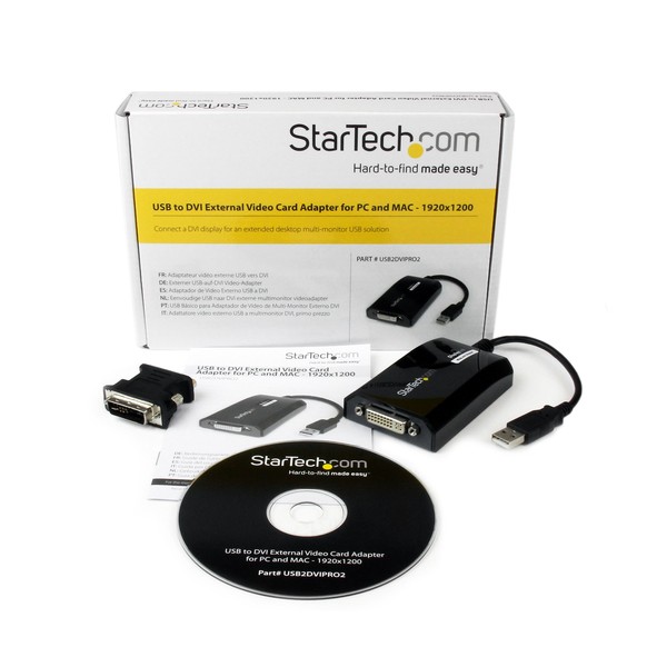 L'adattatore USB-DVI offre video di alta qualità (fino a 1920x1200) per una serie di applicazioni ed è in grado di utilizzare contemporaneamente fino a cinque display aggiuntivi da un singolo computer (utilizzando quattro adattatori video esterni USB2DVIPRO2 ). L'adattatore si collega a un computer host mediante una porta USB 2.0 che funge da scheda video DVI esterna che estende o riproduce il desktop mostrato sul display esistente senza dover aprire il case del computer.
