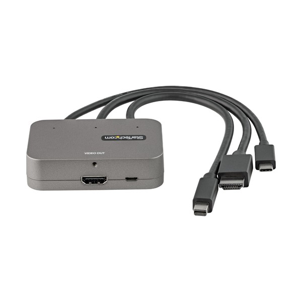 Adattatore AV digitale | 4K 60Hz + HDR | 2 canali audioQuesto adattatore multiporta a HDMI fornisce più opzioni di host, consentendo il collegamento di un dispositivo USB-C™, HDMI® o mini DisplayPort™ a un display HDMI. Supporta la tecnologia HDR (High Dynamic Range) e offre immagini più nitide con una qualità video avanzata.Grazie ai colori più brillanti e al contrasto più elevato, l'adattatore è l'ideale per:• La creazione di elementi visivi accattivanti in campo fotografico, videografico e cinematografico• La conduzione di presentazioni ricche di contenutiSoluzione ad adattatore singoloDotato delle tre connessioni di ingresso più frequenti, questo adattatore audio/video HDMI 4K elimina la necessità di più adattatori ed è compatibile con i dispositivi più comuni, garantendo la connessione ovunque ci si trovi. Può anche essere lasciato collegato in modo permanente ai display HDMI nelle sale riunioni o conferenze, contribuendo a ridurre i tempi di configurazione.Risoluzione 4K effettiva a 60 Hz e HDRL'adattatore HDMI 3-in-1 è perfettamente compatibile con le specifiche HDMI 2.0b e supporta risoluzioni fino a 4K a 60 Hz (3840 x 2160) e larghezze di banda fino a 18 Gbps. Il convertitore video è inoltre retrocompatibile con risoluzioni inferiori, tra cui HD 1080p, ed è quindi l'ideale per l'ufficio o l'home office.Con il supporto della tecnologia HDR, è possibile ottenere immagini realistiche con contrasto, luminosità, colori e brillantezza ottimizzati rispetto alle immagini digitali standard.L'adattatore trasmette inoltre l'audio a 2 canali indipendentemente dall'host a cui è stato eseguito il collegamento, garantendo un'esperienza audio/video perfetta.Configurazione facilitataPer garantire facilità di funzionamento e installazione, questo adattatore multiconnettore consente una configurazione plug-and-play con qualsiasi sistema operativo, inclusi macOS, Windows, Ubuntu, Chrome e Android.Questo convertitore audio/video multiporta è coperto da una garanzia StarTech.com di 3 anni e dal supporto tecnico gratuito a vita.The StarTech.com Advantage