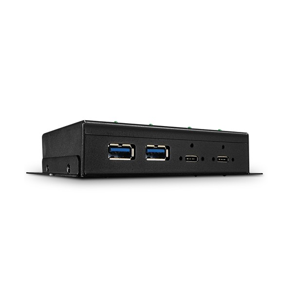 Tutte le porte USB Tipo C sono fornite del sistema di bloccaggio a una o due viti secondo le specifiche USB-IF Tipo C.Ogni porta è fornita di una protezione dai corto circuiti separata e tutte sono conformi alle specifiche per la ricarica rapida delle batterie versione 1.2 che fornisce una potenza massima di 17.5 Watt per tutte le 4 porte. L'hub può essere alimentato tramite l'alimentatore fornito a corredo o tramite gli appositi morsetti garantendo un'alimentazione più stabile e sicura in ambienti critici.