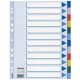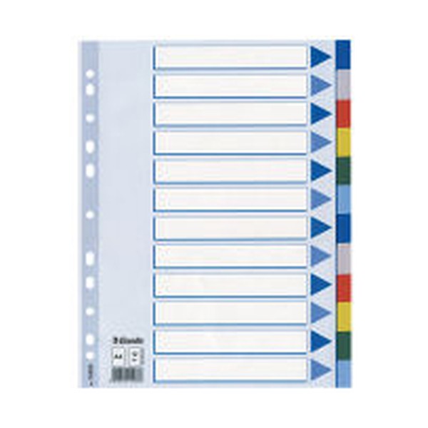 Pagina indice in cartoncino con un design a frecce blu e azzurre e rinforzi in mylar sul lato forato. Tasti a scalino in polipropilene colorato. Il modello Maxi (24,5 x 29,7 cm) consente di suddividere i documenti inseriti in buste a perforazione universale.