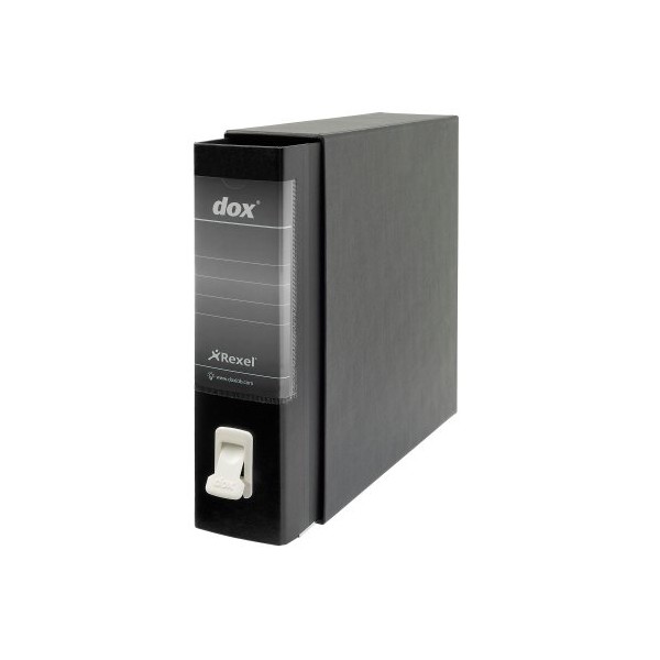 Il registratore a leva Dox 2, è rivestito con carta goffrata antimpronta e rifinito conparalati metallici alla base della plancia. E` dotato di un meccanismo a leva in acciaio nichelato con pressino, linguella di estrazione a scomparsa, e portaetichette con etichetta reversibile. La custodia è rivestita con carta nera goffrata trattata antimpronta con interno nero. Adatto a documenti formato A4 e protocollo.