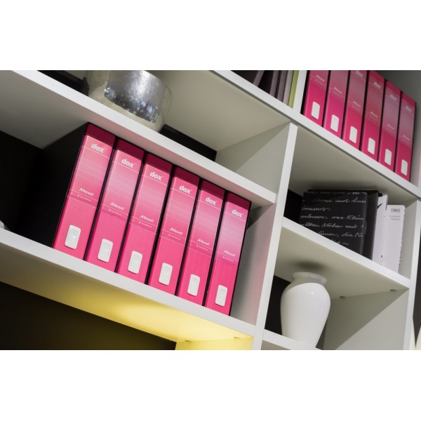 Il registratore a leva Dox 2, è rivestito con carta goffrata antimpronta e rifinito conparalati metallici alla base della plancia. E` dotato di un meccanismo a leva in acciaio nichelato con pressino, linguella di estrazione a scomparsa, e portaetichette con etichetta reversibile. La custodia è rivestita con carta nera goffrata trattata antimpronta con interno nero. Adatto a documenti formato A4 e protocollo.