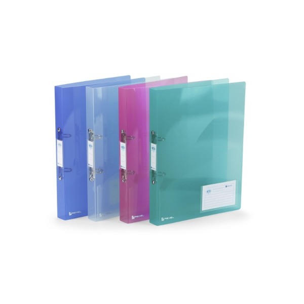 - Raccoglitore a 2 anelli con copertina flessibile o semirigida in polipropilene zigrinato e traslucido - Sicuro meccanismo a due anelli ad “O” da 25 mm - Tasca interna per l’archiviazione di fogli sciolti - Etichetta di identificazione sul dorso - Formato A4 - Portabiglietto da visita per la personalizzazione sul fronte