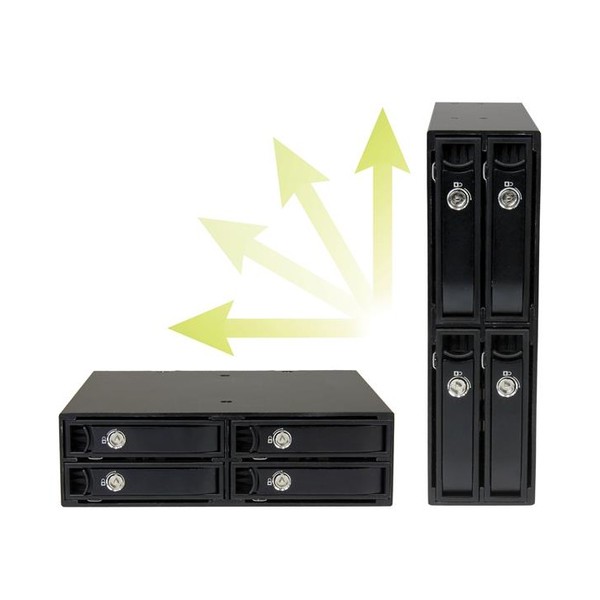 La scheda backplane può essere montata in verticale o in orizzontale, per un inserimento senza errori del tray e la massima compatibilità con i server e i computer desktop. È possibile bloccare i tray in acciaio rimovibili ottenendo un migliore livello di protezione dei dischi. Il connettore NSS (Non-Scratch SATA) offre oltre 50.000 cicli di inserimenti, assicurando prestazioni a lunga durata delle unità e dell'alloggiamento.