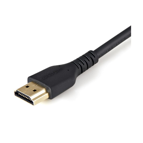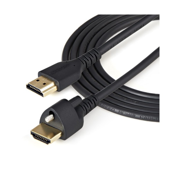 SPECIFICHE: 2 M / Nero / HDMI 2.0 / Fermo a vite superiore HDMI da maschio a maschio senza blocco / Diametro esterno di 4,5 mm, 34 AWG/ Rivestimento: TPE / Schermatura EMI: foglio di alluminio-mylar intrecciato / Garanzia a vita StarTech.com