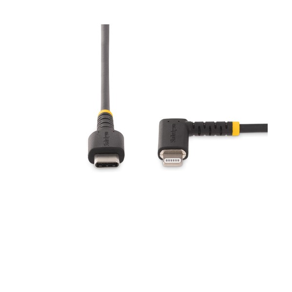 Collega e carica un dispositivo Apple dotato di Lightning, utilizzando un robusto cavo ad angolo rettoQuesto cavo USB-C a Lightning durevole da 1 m consente di stabilire una connessione ad angolo retto con un dispositivo dotato di Lightning (ad esempio, iPhone, iPad, iPad Mini e alcuni iPod) e con una fonte di alimentazione USB Type-C.Costruito per l'Utilizzo QuotidianoIl resistente cavo di ricarica Lightning è dotato di un rinforzo in fibra aramidica che migliora la resistenza alla trazione, all'abrasione e alle sollecitazioni sul cavo. Questo cavo rinforzato è in grado di flettersi senza stirarsi eccessivamente. Inoltre, i connettori sono dotati di rivestimenti metallici ricoperti di TPE completamente sagomato per una maggiore longevità del connettore.Il cavo da USB Tipo-C a Lightning ad angolo retto è stato progettato per evitare la tensione sul cavo/connettore. Le scanalature antistrappo extra-lunghe sono state testate per resistere a più di 5.000 cicli di piegatura con un angolo di 180&deg.Certificato AppleIl resistente cavo da USB-C a Lightning ad angolo retto supporta le specifiche USB 2.0 (480 Mbps). È certificato Apple MFi che garantisce una ricarica rapida fino a 3A e una sincronizzazione affidabile dei dati dalle porte di ricarica USB-C.Questo prodotto è supportato per 2 anni, compresa l'assistenza tecnica gratuita a vita 24/5 multilingue.The StarTech.com Advantage