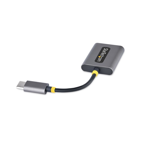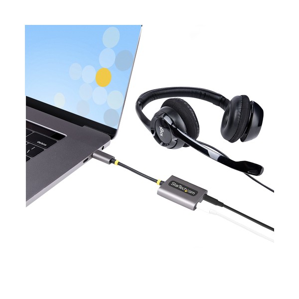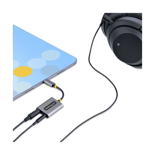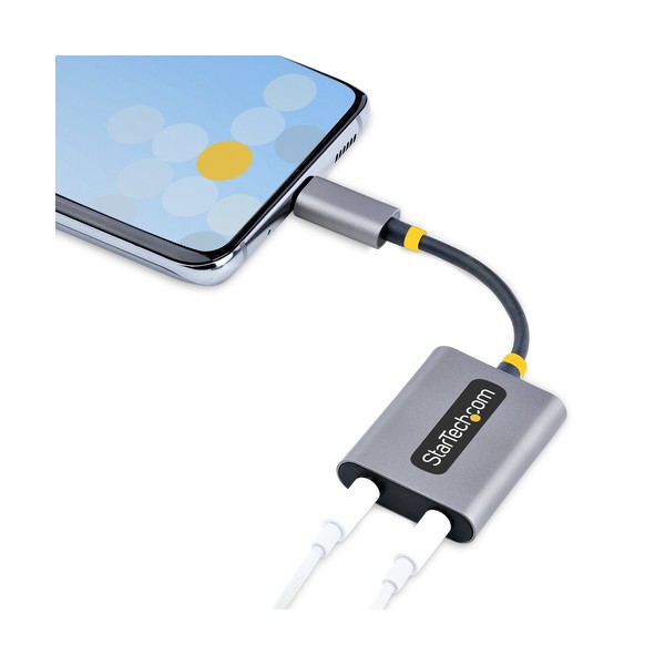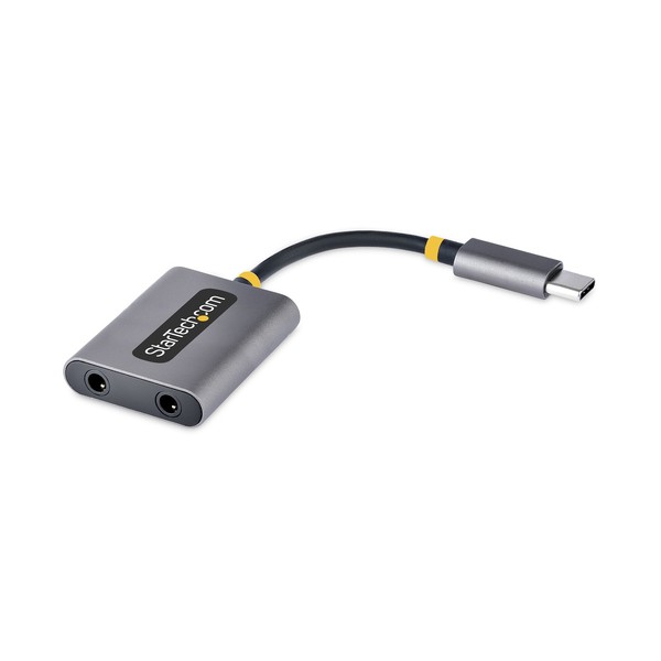 Consente di collegare 2 dispositivi audio con microfono alla porta USB-C®Questo splitter audio USBC-AUDIO-SPLITTER fornisce due connessioni audio per cuffie da 3,5 mm. Le porte da 3,5 mm accettano connettori TRRS da 3,5 mm a 4 poli e supportano l'uscita audio stereo simultanea e l'ingresso per cuffie/microfono. L'adattatore dispone anche di un cavo USB-C integrato da 7 cm.Controllo del microfono delle cuffie/audio stereo sulle porte da 3,5 mmSi possono collegare due cuffie alla stessa porta USB-C. L'ingresso del microfono è supportato da entrambe le cuffie, soluzione comoda per la formazione dei team e le chiamate in conferenza. L'adattatore supporta contemporaneamente due cuffie CTIA o OMTP.Audio senza perdite con cuffie ad alta impedenzaIl dongle USB-C per cuffie è dotato di un convertitore digitale-analogico (DAC) a 24 bit integrato. Il DAC supporta una frequenza di campionamento fino a 192kHz per una qualità e una performance senza compromessi.Design CompattoL'adattatore da USB-C a doppia porta audio è piccolo e leggero, perfetto per i professionisti che sono spesso in viaggio. È costruito con materiali di alta qualità. Dispone di un cavo integrato da 7 cm per una maggiore flessibilità. Offre una soluzione audio affidabile e conveniente per i dispositivi USB-C che non dispongono di un ingresso da 3,5 mm.Questo prodotto è supportato per 2 anni, compresa l'assistenza tecnica gratuita a vita 24/5 in più lingue.The StarTech.com Advantage