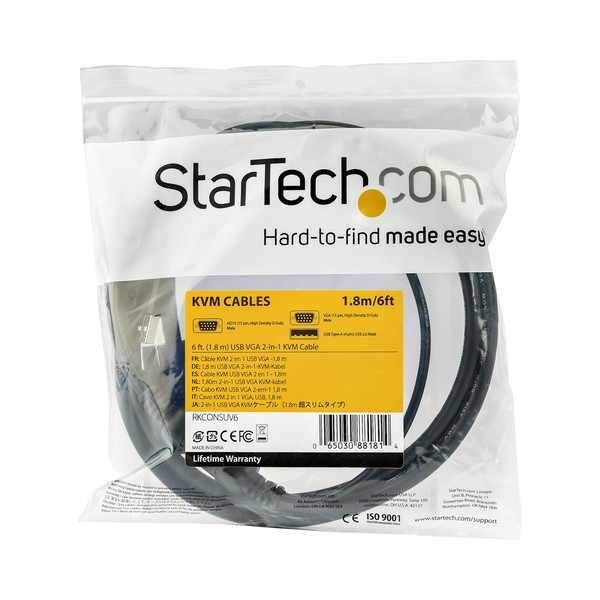 Questo cavo USB KVM da 1,8 m consente di utilizzare un server con tecnologia VGA e USB mediante una console LCD con montaggio a rack e uno switch KVM di StarTech.com.