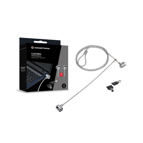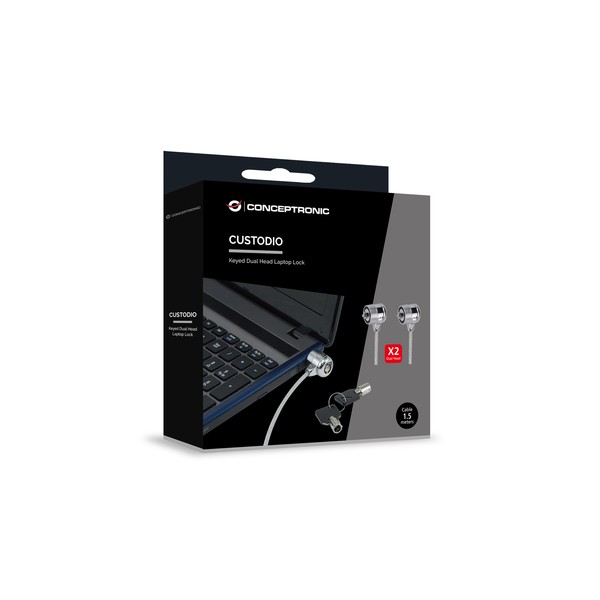 Conceptronic CNBSLOCK15T. Colore del prodotto: Argento, Utilizzo: Computer portatile, Tipo di serratura: 2 Chiavi. Certificati di sostenibilità: REACH, RoHS. Lunghezza cavo: 1,5 m, Diametro del cavo: 4 mm, Profondità: 28 mm. Larghezza imballo: 28 mm, Profondità imballo: 150 mm, Altezza imballo: 150 mm. Numero di cartoni per pallet: 30 pz, Ampiezza del pallet: 120 cm, Lunghezza del pallet: 80 cm