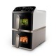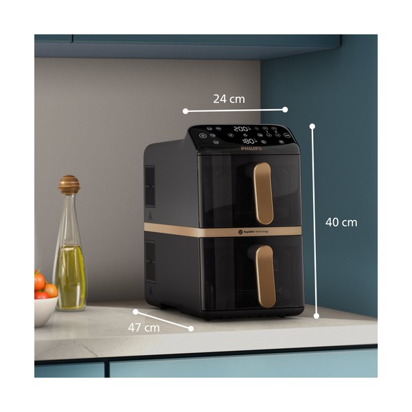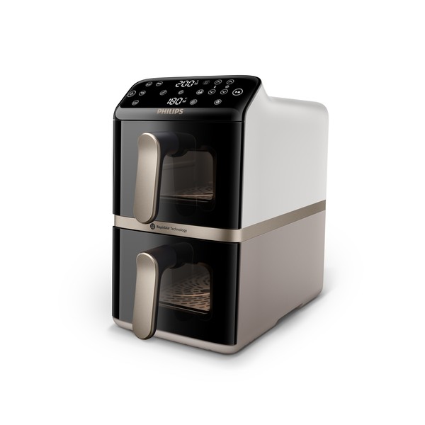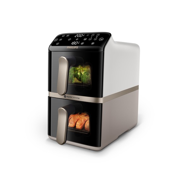 Il doppio dei pasti, con il 45% di spazio in meno La nostra Airfryer con con doppio cestello verticale cuoce due pasti completi in un’unica volta, facendoti risparmiare spazio. Assapora i tuoi piatti cotti deliziosamente, croccanti fuori e teneri dentro, grazie alla tecnologia verticale RapidAir.
