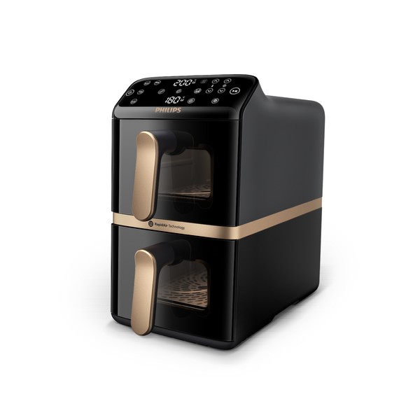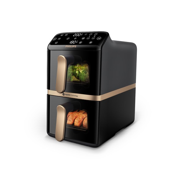 La nostra Airfryer con con doppio cestello verticale cuoce due pasti completi in un’unica volta, facendoti risparmiare spazio. Assapora i tuoi piatti cotti deliziosamente, croccanti fuori e teneri dentro, grazie alla tecnologia verticale RapidAir.