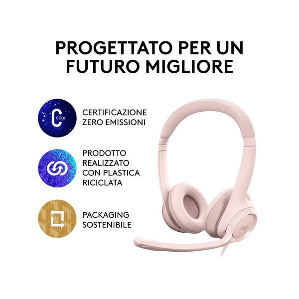 Design Sostenibile: Le parti in plastica delle cuffie Logitech H390 includono plastica riciclata post consumo (23%) e usano carta certificata FSC per un imballaggio responsabile
