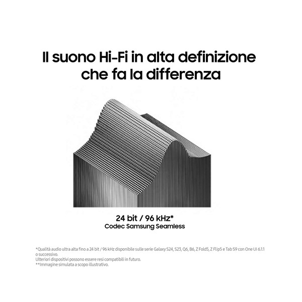Qualità audio ultra alta: dallo studio di registrazione direttamente sui tuoi Galaxy Buds3. Il Codec Samsung Seamless comprime e codifica il suono fino a 24 bit / 96 kHz. Poi lo decodifica sui Galaxy Buds3, mantenendo l'alta fedeltà del suono a 24 bit / 96 kHz, per permetterti di catturare anche i dettagli più intricati, esattamente come voluto dall'autore.