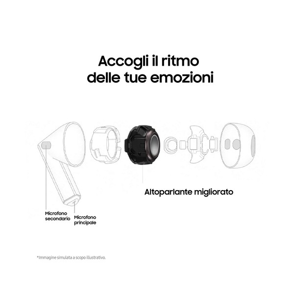 Perditi nel tuo mondo sonoro con EQ adattivo e ANC adattivo assistiti da Galaxy AI. In base alla specifica forma dell'orecchio e alle abitudini di utilizzo, il nostro algoritmo potenziato dall'AI analizza il suono rilevato in tempo reale attraverso i microfoni interno ed esterno. Poi, Galaxy AI ottimizza la tua esperienza di ascolto regolando il suono per adattarlo alle tue esigenze con precisione millimetrica.