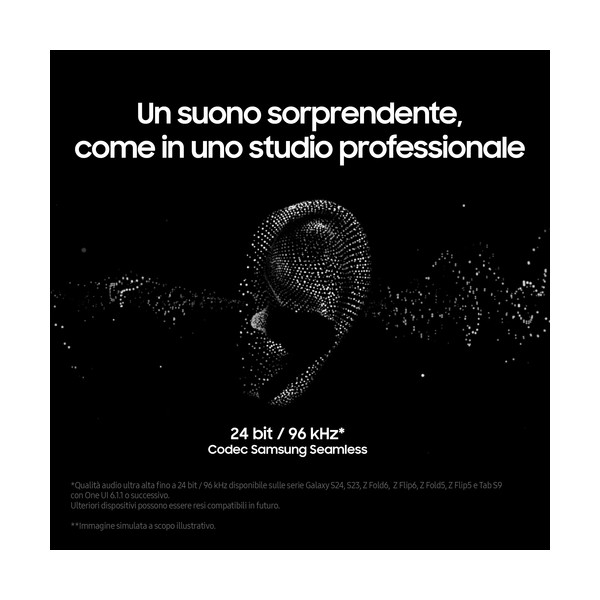 Galaxy AI è finalmente realtà anche sui tuoi nuovissimi Galaxy Buds3 Pro. Non perderti il nuovissimo design, pensato per il massimo comfort e per riprodurre il suono con qualità ottimale. Le iconiche luci LED sui lati dell'auricolare ti permettono di esprimere al massimo la tua personalità. Ascolta ogni nota con nitidezza grazie al CODEC a 24 bit e riduci al minimo la distorsione con Galaxy Buds3 Pro, per la prima volta con doppio amplificatore. Cattura infiniti dettagli grazie all'avanzato altoparlante a 2 vie. Ottieni il massimo dalla tua esperienza di ascolto grazie al controllo del rumore e alla traduzione in tempo reale, potenziati da Galaxy AI.1, 2