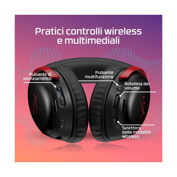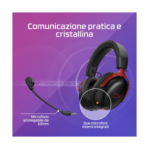 [3], queste cuffie offrono un suono cristallino e un posizionamento audio migliorato, per identificare con precisione i dettagli più critici, come il suono di passi. Il microfono da 10 mm offre una comunicazione chiara con i colleghi, una qualità delle chiamate nitida e conversazioni cristalline con gli amici. Con i pratici controlli audio puoi disattivare o riattivare rapidamente il microfono, regolare il volume e cambiare facilmente la modalità wireless. Che tu stia giocando, ascoltando musica, guardando video su YouTube, navigando su Twitch o lavorando ai compiti di scuola, con le cuffie Cloud III S Wireless non perderai mai una parola, una nota o un colpo!