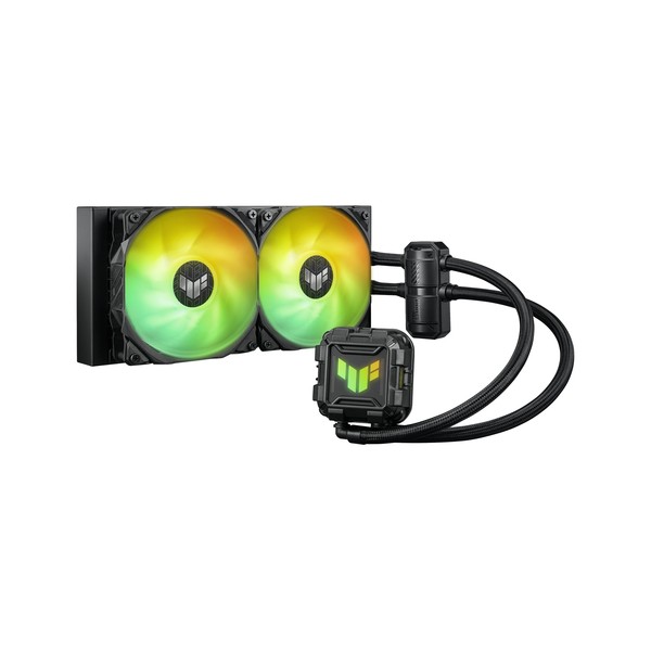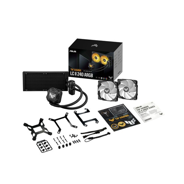 ASUS TUF GAMING LC II 240 ARGB. Tipo: Kit di raffreddamento a liquido, Diametro del ventilatore: 12 cm, Velocità (minima) di rotazione: 800 Giri/min, Velocità (massima) di rotazione: 2000 Giri/min, Rumorosità (velocità alta): 29 dB, flusso d'aria massimo: 67 pdc/min, Flusso d'aria: 113,8 m³/h, pressione dell'aria massima: 3 mmH2O. Colore del prodotto: Nero