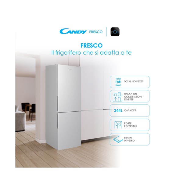 Fresco Fresco è il nuovissimo frigorifero combinato Candy progettato in Italia e disponibile in diverse dimensioni per adattarsi facilmente a qualsiasi tipo di cucina. Grazie al sistema flexy, hai la possibilità di personalizzare gli interni secondo le tue esigenze. Inoltre, con l'app hOn, puoi sfruttare appieno le potenzialità del frigorifero, sia nei modelli connessi WIFI che in quelli dotati di app solo contenuto.