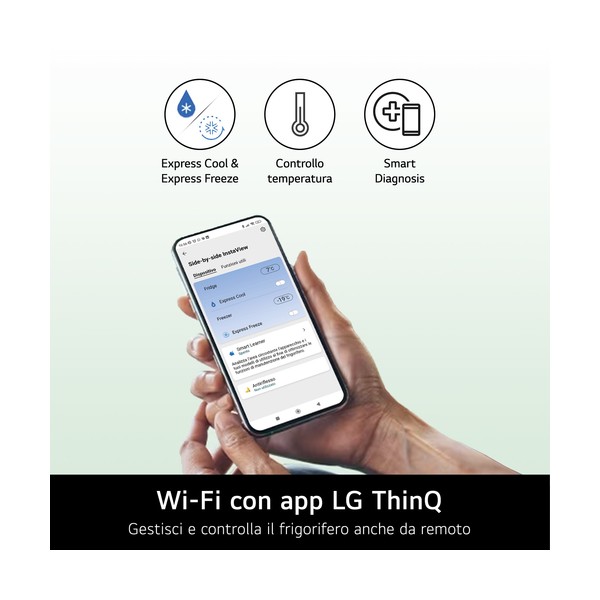 Gestione del frigorifero tramite Wi-Fi e app LG ThinQCollega il frigorifero al Wi-Fi e scarica l'app LG ThinQ sul tuo smartphone iOS o Android per avere a portata di mano tante funzioni e gestire il frigorifero anche quando sei fuori casa. Ad esempio, puoi impostare le temperature del frigorifero e del congelatore, oppure attivare la funzione di raffreddamento rapido quando stai tornando dal fare la spesa. Inoltre, puoi monitorare i consumi direttamente dal tuo smartphone.