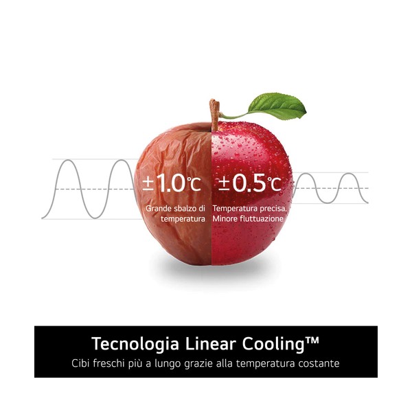 Tecnologia Linear Cooling™Per conservare meglio i cibi in frigorifero, è importante che la temperatura al suo interno resti più costante possibile. Rispetto ai frigoriferi tradizionali, che possono avere fluttuazioni di temperatura di ±1°C, la nostra tecnologia Linear Cooling™ mantiene la temperatura del frigo costante, con differenze di solo ±0,5°C. In questo modo puoi conservare i tuoi cibi più a lungo mantenendone la freschezza.