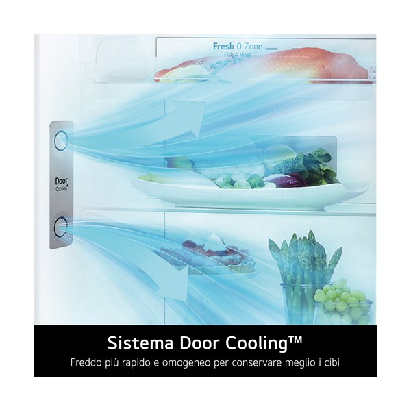 Sistema Door Cooling™Ti sei mai accorto che la temperatura del frigorifero non è uniforme in tutte le zone? Questo perché le bocchette di aria sono poste sulla parte posteriore, rendendo il raffreddamento della zona della porta meno efficace. Con il sistema Door Cooling™, invece, la bocchetta supplementare posta lateralmente raffredda più velocemente e più efficacemente le zone del frigo, compresa quella della porta, migliorando la conservazione degli alimenti.