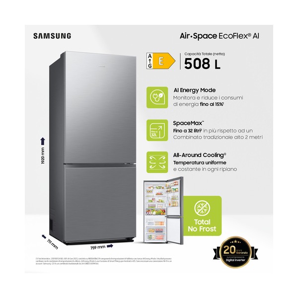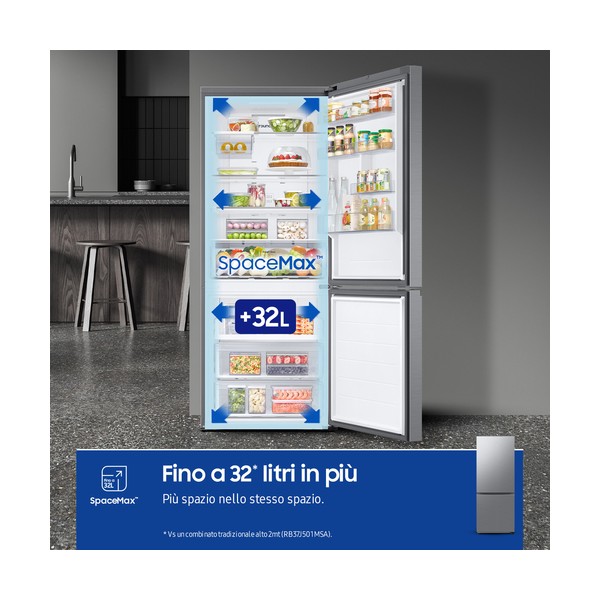 [1] garantisce una capacità interna superiore con una profondità di 711 mm. Lisolante a elevata efficienza della tecnologia SpaceMax™ consente di ridurre notevolmente lo spessore delle pareti, creando più spazio per la conservazione degli alimenti, senza antiestetiche sporgenze esterne.