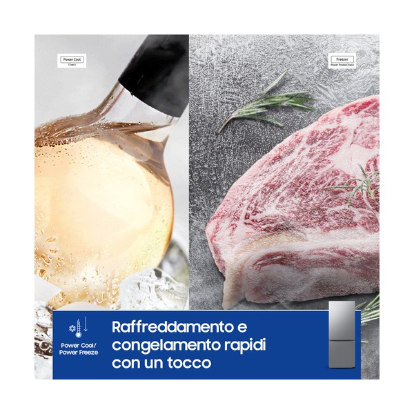 Anche la velocità è importante. Premendo un pulsante, la funzione Power Cool fa circolare un potente getto daria fredda nel frigorifero per raffreddare rapidamente cibi e bevande. La funzione Power Freeze fa la stessa cosa nel freezer. È il massimo per congelare o raffreddare i cibi al punto giusto, ma anche per preparare il ghiaccio.