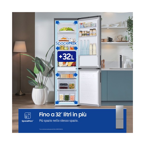 [1] garantisce una capacità interna superiore con una profondità standard di 60 cm, allineandosi perfettamente con gli altri mobili della cucina, infatti sborda solamente la porta. L'isolante altamente efficiente della tecnologia SpaceMax™ consente di ridurre notevolmente lo spessore delle pareti, creando più spazio per la conservazione degli alimenti, senza antiestetiche sporgenze esterne.