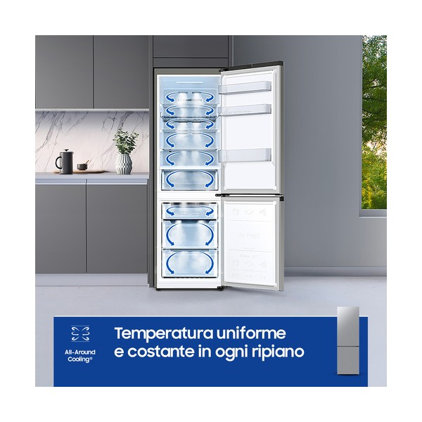 La sicurezza di un raffreddamento adeguato - in ogni zona del frigorifero. Il sistema All Around Cooling garantisce un freddo uniforme in ogni zona del frigorifero. Controlla costantemente la temperatura e fa circolare l'aria fredda attraverso bocchette collocate in posizioni strategiche. In questo modo ogni ripiano viene raffreddato in modo ottimale e gli alimenti rimangono più freschi.