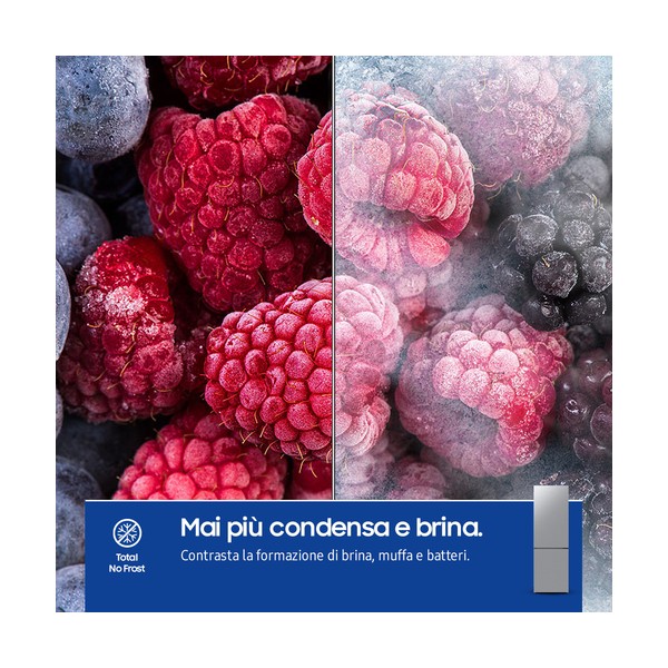 Evita di sprecare tempo ed energia per sbrinare il frigorifero. La tecnologia Total no frost ottimizza la circolazione dell'aria per mantenere una temperatura costante che impedisce la formazione di ghiaccio. Inoltre raggiunge la temperatura impostata molto più rapidamente, richiedendo meno energia al sistema di raffreddamento che dura quindi più a lungo.