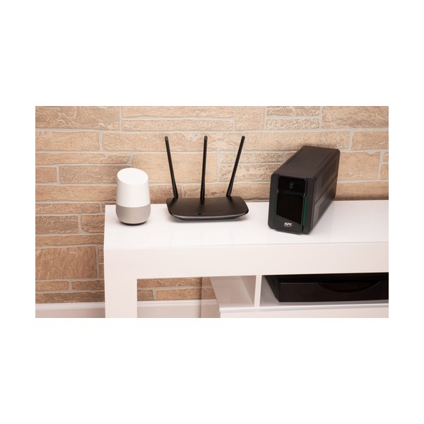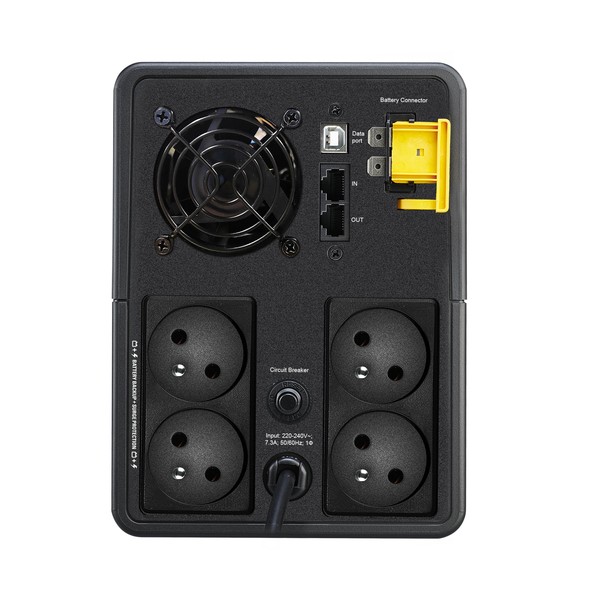 APC Back-UPS 1600VA 230V AVR French Sock. Topologia UPS: A linea interattiva, Potenza in uscita: 1,6 kVA, Potenza in uscita: 900 W. Tipo di uscita AC: Tipo E, Presa di corrente: Tipo F, Quantità prese AC: 4 presa(e) AC. Tecnologia batteria: Acido piombo (VRLA), Tempo di salvataggio minimo a pieno carico: 1 min, Tempo di salvataggio minimo a mezzo carico: 6,5 min. Fattore di forma: Compatta, Colore del prodotto: Nero, Lunghezza cavo: 1,2 m. Larghezza: 140 mm, Profondità: 390 mm, Altezza: 190 mm
