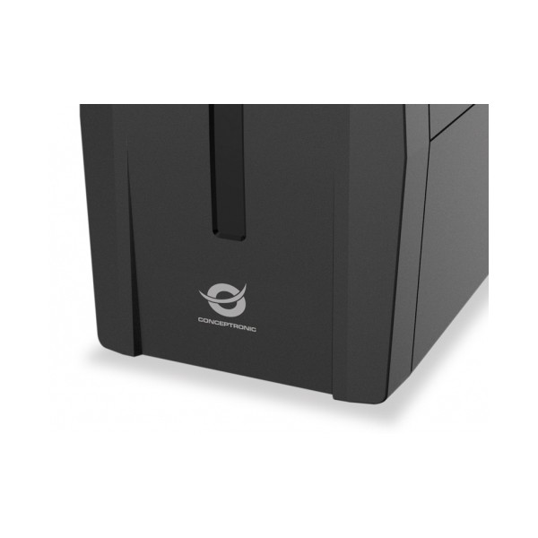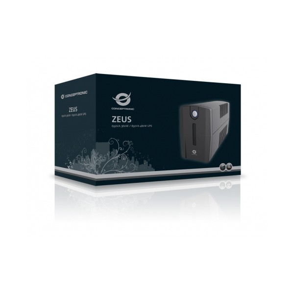 Conceptronic ZEUS 02E. Potenza in uscita: 850 VA, Potenza in uscita: 480 W, Tensione operativa in entrata (min): 220 V. Tipo di uscita AC: IEC Jumpers, Quantità prese AC: 4 presa(e) AC. Tempo di ricarica della batteria (90%): 8 h, Voltaggio della batteria: 12 V. Fattore di forma: Compatta, Colore del prodotto: Nero. Topologia UPS: A linea interattiva, Funzioni di protezione dalla corrente: Sovraccarico, Modalità allarme acustici: Allarme in funzionamento a batteria, Guasto, Allarme per batteria scarsa, Allarme di sovraccarico