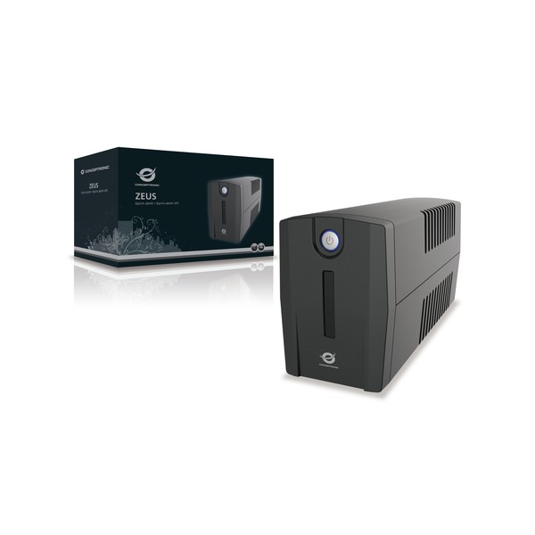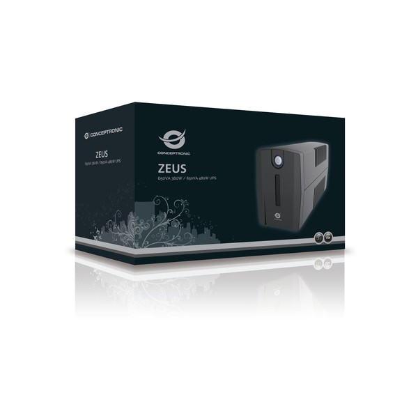 Conceptronic ZEUS02ES. Potenza in uscita: 850 VA, Potenza in uscita: 480 W, Tensione operativa in entrata (min): 220 V. Tipo di uscita AC: Tipo F, Quantità prese AC: 2 presa(e) AC. Tipo batteria: MS7-12B, Tempo di ricarica della batteria (90%): 8 h, Voltaggio della batteria: 12 V. Fattore di forma: Compatta, Colore del prodotto: Nero. Topologia UPS: A linea interattiva, Funzionalità di protezione dell'alimentazione: Sovraccarico, Modalità allarme acustici: Allarme in funzionamento a batteria, Guasto, Allarme per batteria scarsa, Allarme di sovraccarico