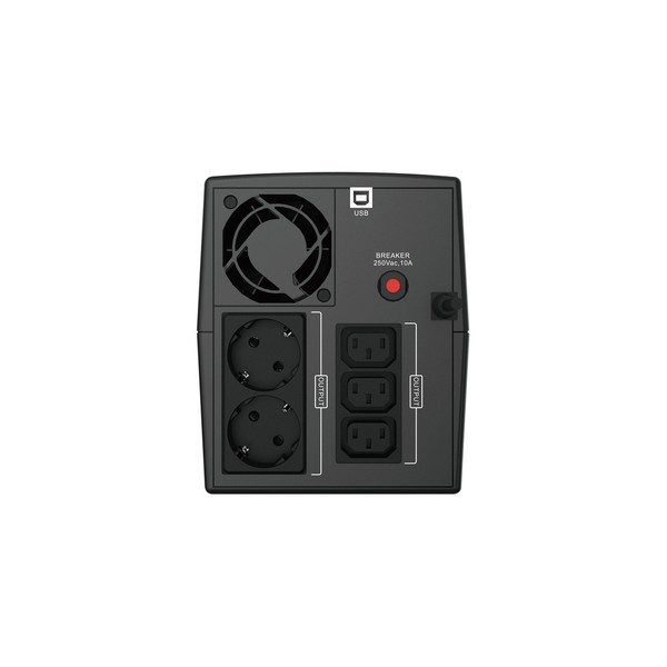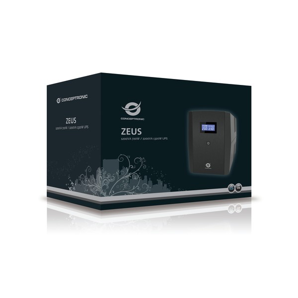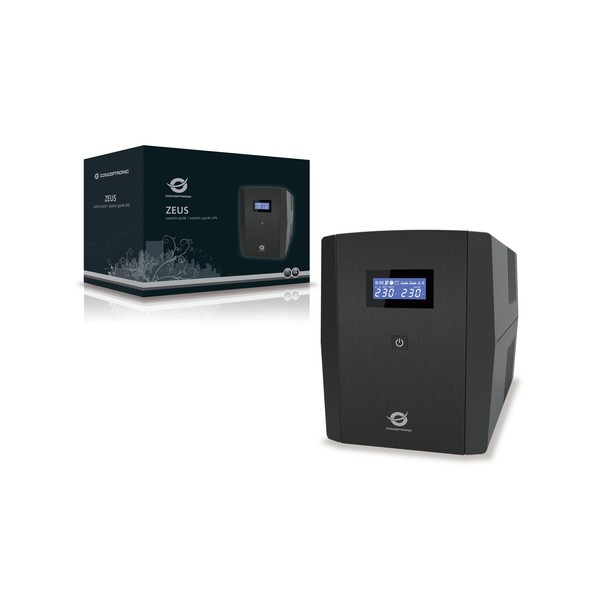 Conceptronic ZEUS03EM. Potenza in uscita: 1200 VA, Potenza in uscita: 720 W, Tensione operativa in entrata (min): 220 V. Tipo di uscita AC: IEC Jumpers, Tipo F, Quantità prese AC: 5 presa(e) AC. Tipo batteria: MS7-12B, Tempo di ricarica della batteria (90%): 8 h, Voltaggio della batteria: 24 V. Fattore di forma: Compatta, Colore del prodotto: Nero. Topologia UPS: A linea interattiva, Funzionalità di protezione dell'alimentazione: Sovraccarico, Modalità allarme acustici: Allarme in funzionamento a batteria, Guasto, Allarme per batteria scarsa, Allarme di sovraccarico