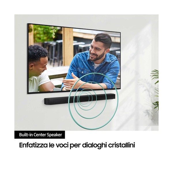 Ascolta ogni dialogo in modo incredibilmente nitido con la soundbar Samsung. Laltoparlante centrale dedicato migliora la resa delle voci per un risultato più pulito.