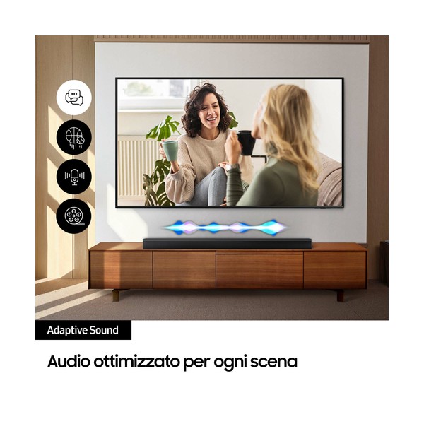 La funzione Adaptive Sound ottimizza automaticamente il suono per contenuti audio specifici, per distinguere nitidamente voci e suoni in base al contenuto e al volume.