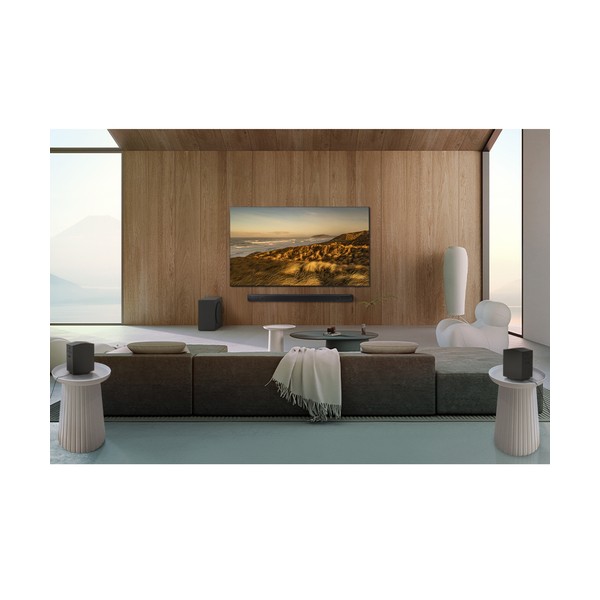 Grazie agli altoparlanti posteriori wireless con emissione verso l'alto, il suono raggiunge ogni angolo della stanza e viene riflesso dal soffitto, per trasformare il tuo salotto in una sala cinematografica.