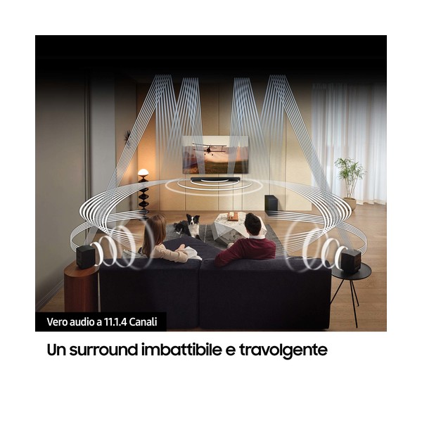 Un sistema pensato per diffondere il suono da ogni angolazione, con 11 canali anteriori e surround, compresi gli altoparlanti posteriori, 1 canale subwoofer e 4 canali con emissione verso lalto, per un'esperienza incredibilmente immersiva.