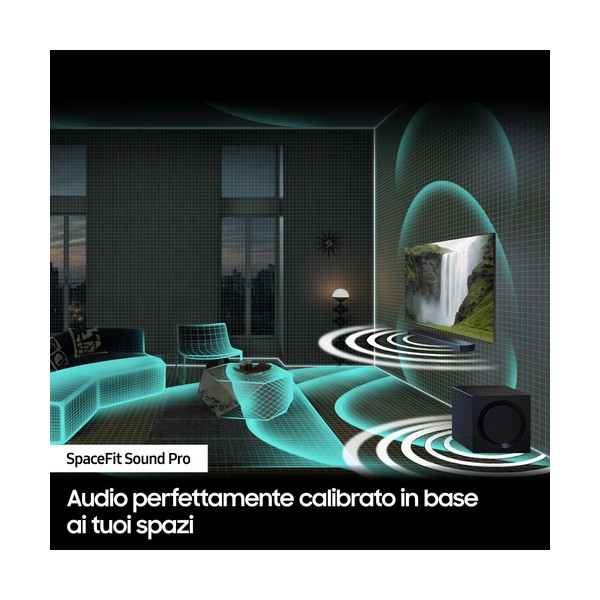 SpaceFit Sound Pro è levoluzione della tecnologia SpaceFit Sound. Con questo sistema sarà la soundbar ad analizzare le condizioni dellambiente per adattare il suono allo spazio, per un audio estremamente nitido e immersivo con bassi ottimizzati.