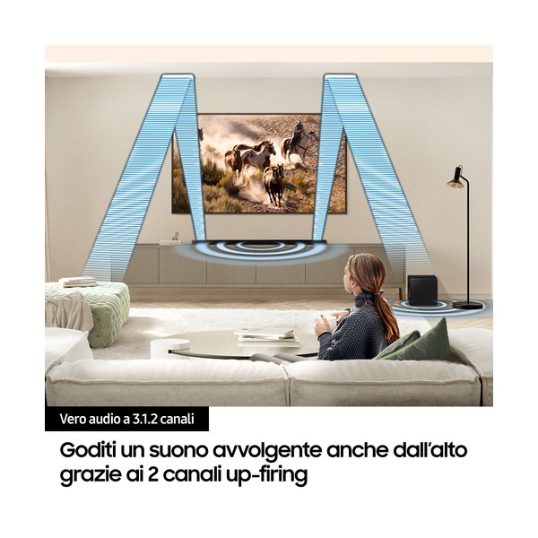Con la tecnologia Q-Symphony gli altoparlanti del TV e la soundbar riprodurranno suoni contemporaneamente per ottenere la massima sinergia, con un audio ottimizzato basato sullAI che viene diffuso da tutti i canali.