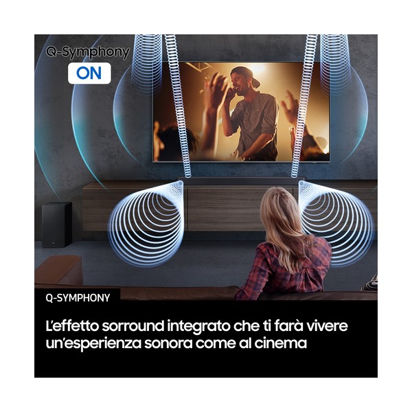 Con Q-Symphony, l'AI separa la voce dai suoni di sottofondo per riprodurli utilizzando il canale più indicato. In questo modo, i dialoghi saranno più nitidi e l'audio surround 3D sarà ancora più avvolgente, con gli altoparlanti del televisore e la soundbar che lavorano in perfetta armonia.